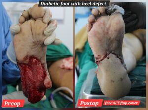 A 56-year-old female with type 2 diabetes and hypertension, controlled with oral medications, presented to the General Surgery Department with a history of a diabetic foot ulcer o”er the heel, complicated by spreading cellulitis. The wound was surgically debrided, leaving a large defect measuring approximately 15 x 10 cm, exposing the tendoachilles and calcaneus bone. An arterial Doppler study revealed atherosclerotic changes with monophasic flow in both the peroneal and posterior tibial arteries (PTA). The foot was being perfused only by the anterior tibial artery (ATA). A below-knee amputation was initially planned. However, a referral was made to the Plastic Surgery Department to explore the possibility of limb salvage using a microvascular free flap. The patient was counseled about the potential benefits and risks. Given the compromised blood flow in the ATA, using it for flap anastomosis might have compromised the residual foot blood supply. Therefore, the decision was made to anastomose the flap to the proximal healthy PTA using a vein graft. The procedure was successfully performed by Dr. Nagamallesh C.S, Plastic Surgeon, with the assistance of Dr. Prajwal Shastry and Dr. Gaganadeepa. C, Under the guidance of  Dr. K S Gangadhara, Dr. Krishnamurthy, and Dr. Vijay BN, with the support of Department of Anesthesiology headed by Dr. Renuka. The patient’s limb was successfully salvaged with microvascular reconstruction. Postoperatively, the patient recovered well and is now independently ambulatory, without significant psychological trauma.